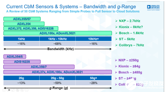 經(jīng)過(guò)對(duì)比不難發(fā)現(xiàn),兩款傳感器在靈敏度上非常接近,而ADXL1002隨頻率的相移相對(duì)于對(duì)比產(chǎn)品要小一半,底噪上壓電陶瓷要比MEMS小一些。在成本方面,Eason介紹,壓電陶瓷比MEMS高出許多——$100 vs $30。以下是ADI常用于振動(dòng)監(jiān)測(cè)的加速度傳感器選型: