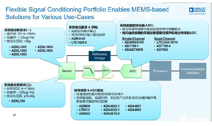ADI除了MEM加速度傳感器,還可以在整個(gè)信號(hào)采集信號(hào)鏈上提供完整解決方案: