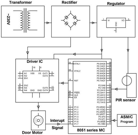 如果門附近有人體運(yùn)動(dòng),則人體發(fā)出的紅外輻射將使傳感器產(chǎn)生感應(yīng)信號,該信號被饋送到微控制器。然后,微控制器通過驅(qū)動(dòng)器IC控制和操作門電機(jī)。因此,如果有人靠近門,則微控制器將發(fā)送一個(gè)命令以打開門,并設(shè)置一個(gè)延時(shí)時(shí)間以自動(dòng)關(guān)閉門。該項(xiàng)目旨在用于購物商場,劇院和酒店的門。