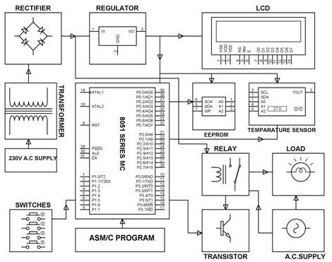 LCD用于顯示-55至+125度范圍內(nèi)的溫度。EEPROM用于由用戶通過8051系列微控制器存儲(chǔ)預(yù)定義的溫度設(shè)置。該繼電器的觸點(diǎn)用于負(fù)載,由微控制器使用晶體管驅(qū)動(dòng)器驅(qū)動(dòng)。