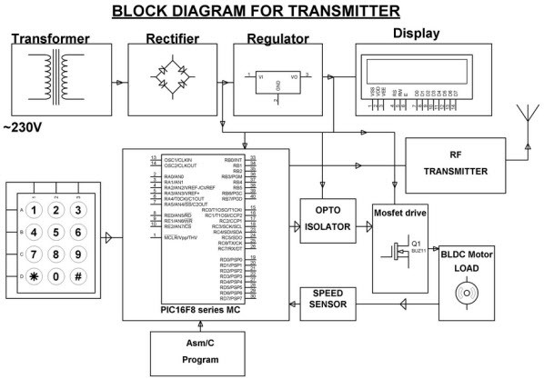 基于PIC微控制器的項(xiàng)目,使用無線技術(shù)在工業(yè)中實(shí)現(xiàn)多個(gè)電機(jī)的速度同步是速度傳感器的典型應(yīng)用。行業(yè)中的多種電動(dòng)機(jī)之一被認(rèn)為是充當(dāng)發(fā)送器的主電動(dòng)機(jī),其余電動(dòng)機(jī)充當(dāng)接收器,它們將跟隨主電動(dòng)機(jī)的速度。本項(xiàng)目中使用的主電機(jī)和接收電機(jī)是BLDC電機(jī),它們是通過PWM控制和射頻無線通信模式進(jìn)行控制的。