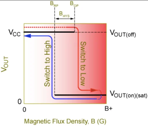 呈現(xiàn)出足夠強(qiáng)度(磁通密度)的正磁場(chǎng)(南極)的磁體將導(dǎo)致設(shè)備切換到導(dǎo)通狀態(tài)。一旦打開(kāi),單極IC將保持導(dǎo)通狀態(tài),直到磁場(chǎng)消失并且IC恢復(fù)為截止?fàn)顟B(tài)為止。