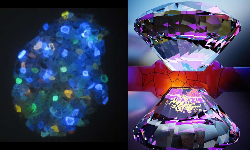 左圖是天然鉆石由于其不同的氮空位(NV)中心而在紫外線下發(fā)光。右側(cè)是示意圖,顯示了正在運(yùn)行的金剛石砧,NV中心位于底部砧。NV傳感器在被激光激發(fā)時(shí)會(huì)發(fā)出明亮的紅色陰影。通過(guò)探測(cè)這種熒光的亮度,研究人員能夠看到傳感器如何響應(yīng)環(huán)境中的細(xì)微變化。(圖片來(lái)源:姚諾/伯克利實(shí)驗(yàn)室;埃拉·馬魯申科)