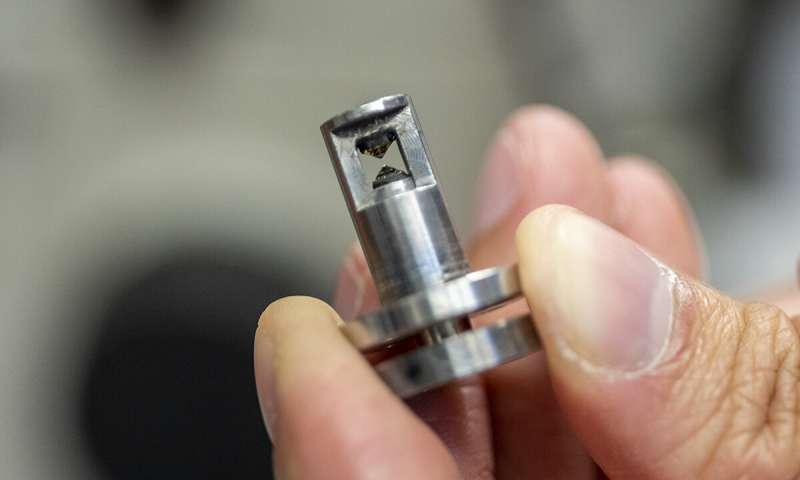 鉆石砧室。通過(guò)在這兩個(gè)相對(duì)的砧座之間壓縮樣品,可以獲得大于地球中心的壓力。圖片來(lái)源:Marilyn Sargent /伯克利實(shí)驗(yàn)室