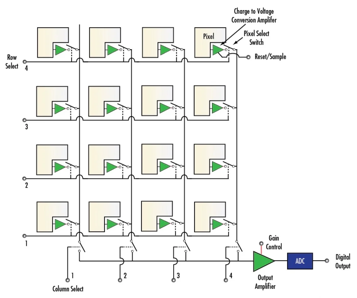 光電探測(cè)器的二維陣列用于感測(cè)入射光強(qiáng)度。光電探測(cè)器產(chǎn)生的電荷被轉(zhuǎn)換為電壓信號(hào),并通過“行選擇”和“列選擇”開關(guān)陣列傳遞到輸出放大器。ADC 用于數(shù)字化放大的信號(hào)。