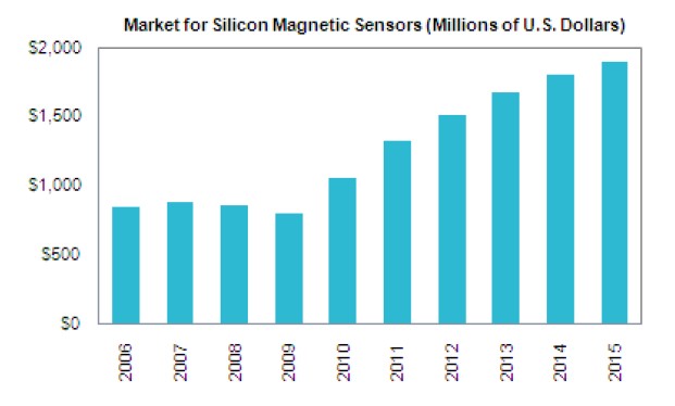 磁傳感器進入了加速發(fā)展的時代。度過了2009的低潮,到了2010基于硅的磁傳感器有了快速的增長,覆蓋了各個領域,特別是在汽車和消費市場領域。從2009年到2010年數量增加了38%。預期這個市場在2015年將會達到19億美金,比2010年的11億美金,復合增長率為12%。