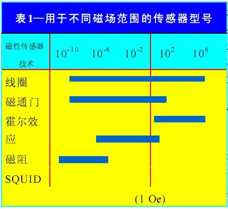 磁場測量可分為三個(gè)范圍。在每個(gè)范圍中,能在其環(huán)境中處于最佳工作狀態(tài)的磁性傳感器型號(hào)也不同。第一個(gè)磁場范圍遠(yuǎn)大于地球磁場(如在永久磁鐵或大電流附近)。其范圍為 100 奧斯特(Oe) 或更高。第二個(gè)磁場范圍約等于地球磁場或0.6 Oe 。第三個(gè)磁場范圍遠(yuǎn)遠(yuǎn)小于地球磁場,它們在 1 mOe 或更低范圍內(nèi)。地球磁場常用作受鐵磁物體干擾的背景磁場,如在磁異態(tài)檢測中的鐵磁物體。表 1 給出了用于不同磁場范圍的傳感器型號(hào) 。