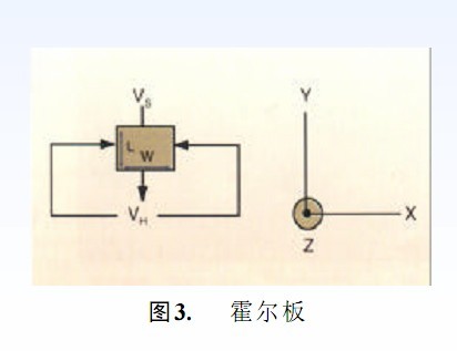 圖 3 中所示為導(dǎo)電材料的矩形薄板,沿Y軸施加了一個(gè)電壓VS,在板的霍垂直方向施加了一個(gè)磁場 B(沿 Z 軸),霍爾電壓VH由下式求得VH= uH(W/L)BVs  其中uH是霍爾遷移,W是霍爾板的寬度,L 是長度! ∮捎诼鍋銎澚ψ饔迷谟脤(dǎo)電材料制成的電荷載體上而產(chǎn)生的霍爾效應(yīng)等于:F=q(vB) 其中 q 是電荷載體上的電荷,v 是電荷載體的速度,B 是磁場,力使電流變形,并將其擠向?qū)щ姲宓囊粋?cè)。這造成 X 軸上的等勢線變,形導(dǎo)致產(chǎn)生霍爾電壓。如果霍爾板的長度遠(yuǎn)大于寬度,則霍爾電磁場與洛侖茲力相平衡。電流變成與 Y軸平行。最實(shí)用的半導(dǎo)體霍爾元件一般來說是正方形。此時(shí)電流相對(duì)于勵(lì)磁電壓有一個(gè)角度。