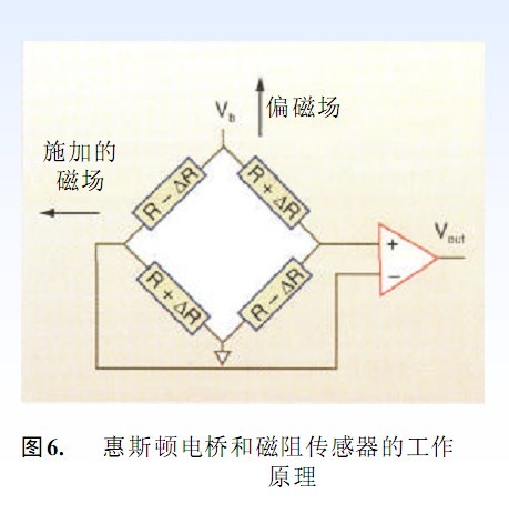 惠斯頓電橋是磁阻傳感器的基礎(chǔ)電氣元件。圖5說明了磁阻傳感器的工作原理和一個(gè)MR板對(duì)外部磁場的典型響應(yīng)。圖6所示為用四個(gè)磁控電阻器制成的惠斯頓電橋帶有一個(gè)供電電壓Vb,致使電流通過電阻器。如圖所示,施加一個(gè)偏磁場,使在所有電阻中的磁化強(qiáng)度和電流間有一個(gè)約45°的夾角。如果電阻器是同一種結(jié)構(gòu),則所有四個(gè)電阻器的電阻是相同的,正交施加磁場h的R.A,使兩個(gè)反向放置的電阻器磁化而轉(zhuǎn)向電流,使電阻有一個(gè)增量△R,在剩下的兩個(gè)反向放置的電阻器中,由于磁化而轉(zhuǎn)離電流,導(dǎo)致電阻減少△R 。