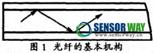 如圖1所示,光纖由高折射率的纖芯和包層兩部 分組成,纖芯的折射率大于包層的折射率,包層直徑 大致為0.1~0.2mm,光線通過端面透入纖芯,在與包 層的交界面處發(fā)生光線的完全內(nèi)反射,光線反射至纖 芯層,經(jīng)過不斷反射,光線沿著纖芯向前傳播。