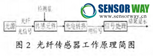 光纖傳感系統(tǒng)由光源、光導(dǎo)纖維、光傳感元件,光調(diào)制元件和信號處理五部分組成,其工作原理如圖2所示。光源發(fā)出的光經(jīng)過光導(dǎo)纖維進(jìn)入光 傳感元件,而在光傳感元件中受到周圍環(huán)境場的彩 響而發(fā)生變化的光再進(jìn)入光調(diào)制機(jī)構(gòu),由其將傳感 元件測量的參數(shù)調(diào)制成幅度、相位、偏振等信息, 最后利用微處理器進(jìn)行信號分析。