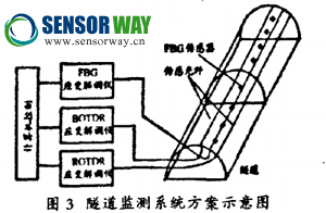 光纖傳感器在隧道上應(yīng)用比較成熟,例如武漢 的天興洲大橋上有成百上千個光纖傳感測點(diǎn),時時 監(jiān)控橋梁的結(jié)構(gòu)、受力和振動等情況,一旦發(fā)現(xiàn)異 常,管理機(jī)構(gòu)就能立即采取措施。以某湖底隧道為 例,施工地質(zhì)條件不理想,難度大,尤其是湖區(qū)沙 層分布廣泛,厚度大,對隧道結(jié)構(gòu)采用了分布式 BOTDR光纖檢測系統(tǒng),沿隧道軸向敷設(shè)4根光纖, 其中兩根全面接著(監(jiān)測隧道整體變形),兩根定 點(diǎn)接著(監(jiān)測變形縫和潛在變形處的變形情況)。 通過采用光纖傳感器對隧道進(jìn)行監(jiān)測,實時監(jiān)測隧 道變形情況,能夠獲得可靠的數(shù)據(jù),可分析出正確 結(jié)果,反映隧道實際受力情況,起到隧道的健康監(jiān) 測、預(yù)防保護(hù)作用;能夠體現(xiàn)出光纖光柵傳感器的強(qiáng)大優(yōu)勢,保證了施工的順利進(jìn)行,提升了施工質(zhì)量。光纖傳感器在橋梁隧道監(jiān)測方面的應(yīng)用主要有 以下三個方面:對采用新型復(fù)合材料的橋梁結(jié)構(gòu)進(jìn) 行監(jiān)測,掌握材料和結(jié)構(gòu)的工作性能;對交通樞紐或具有重大意義的大型橋梁進(jìn)行健康監(jiān)測,掌握橋 梁的正常運(yùn)行狀態(tài);對有一定損傷的舊橋進(jìn)行監(jiān) 測,從而了解其健康狀況并采取針對性的維護(hù)和加固措施。如圖3所示: