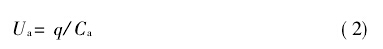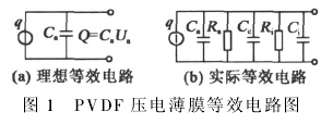 式中q為極板上聚集的電荷量;Ca為PVDF壓電薄膜兩個(gè)表面間的等效電容。所以,可以把PVDF壓電薄膜看成是一個(gè)等效電荷源和一個(gè)電容器相并聯(lián),如圖1(a)所示。在實(shí)際測量中,PVDF壓電薄膜傳感器還必須考慮外接電路的電容和電阻,因此,PVDF壓電薄膜傳感器的實(shí)際等效電路[4]如圖1(b)所示。在此等效電路中,傳感器的絕緣電阻與前置放大器的輸入電阻相并聯(lián),為了保證傳感器的低頻響應(yīng),盡量減少靜態(tài)測量誤差,要求傳感器的絕緣電阻應(yīng)保持在1 013Ψ以上,才能使電荷泄露減少到滿足精度要求。同時(shí)前置放大器要有較大的輸入電阻,以防止傳感器的電荷通過輸入電路泄露。