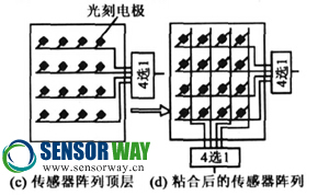 (2)PVDF壓電薄膜的兩面分別與頂、底層的光刻電極相連接,連接材料為銀粉導(dǎo)電膠,同時(shí)在絕緣薄膜的空白處涂上502粘合劑,干燥幾分鐘后,迅速將三層粘合在一起,粘合后的陣列傳感器如圖2(d)所示。