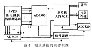 系統(tǒng)的工作原理是在單片機(jī)的控制下,由切換電路完成對傳感單元的選擇,被選擇的PVDF壓電薄膜傳感器經(jīng)電荷-電壓轉(zhuǎn)換及相應(yīng)的信號調(diào)理電路變成0~5V的電壓信號,再經(jīng)過AD7820進(jìn)行模數(shù)轉(zhuǎn)換,轉(zhuǎn)換結(jié)果通過AT89C51暫存于片外存儲單元(本文采用靜態(tài)RAM芯片62256),并在檢測完畢后,通過RS232串行通信接口傳送到計(jì)算機(jī)進(jìn)行處理與顯示。測量系統(tǒng)的結(jié)構(gòu)框圖如圖4所示。