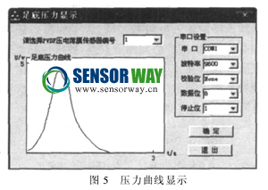 數(shù)據(jù)采集和模數(shù)轉(zhuǎn)換是借助DP-51PROC單片機(jī)綜合仿真實(shí)驗(yàn)儀來完成的。采集的數(shù)據(jù)通過RS-232串口通信傳送至計(jì)算機(jī)進(jìn)行處理與顯示。本文用VC+ +6.0編程實(shí)現(xiàn)串口通信,并進(jìn)行數(shù)據(jù)處理。測試時(shí),由人體足底前掌部對傳感器陣列施加一動(dòng)態(tài)壓力,經(jīng)過數(shù)據(jù)處理,可獲取每只傳感器對應(yīng)的壓力曲線。圖5為某一時(shí)刻,第1只PVDF壓電薄膜傳感器(位于第5跖骨)對應(yīng)的壓力曲線。僅從圖形上相比較,該結(jié)果與文獻(xiàn)記載的足底壓力曲線相似。一旦對PVDF壓電薄膜進(jìn)行標(biāo)定,便能準(zhǔn)確測量出該部位在任一時(shí)刻的壓力大小。