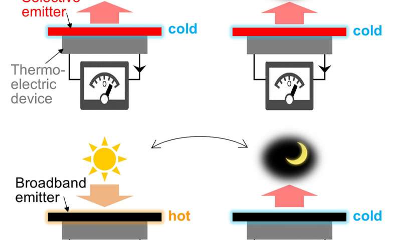 在本周于《應(yīng)用物理學(xué)快報(bào)》上發(fā)表的一項(xiàng)研究中,作者測試了一種由波長選擇發(fā)射器組成的熱電設(shè)備,該設(shè)備在白天使用輻射冷卻不斷地冷卻該設(shè)備,使熱能從設(shè)備中散布到空氣中。結(jié)果,設(shè)備的頂部比底部的溫度更低,從而導(dǎo)致溫差,從而在白天和黑夜以及各種天氣條件下產(chǎn)生恒定電壓。