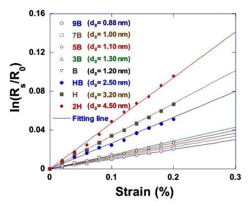 不同等級(jí)鉛筆的相對(duì)電阻與施加應(yīng)力之間的關(guān)系。差異源自相鄰石墨之間的初始隧穿距離的變化。