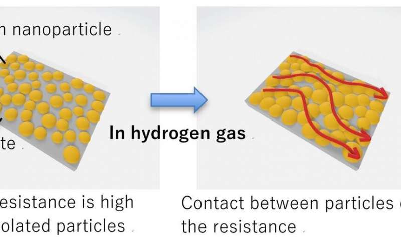 使用鈀納米顆粒進(jìn)行氫感測的示意圖。如果沒有氫存在,金屬鈀納米粒子(橙色點)將充當(dāng)孤立的島,電流將不會輕易流過器件。相反,當(dāng)設(shè)備暴露于少量氫氣時,氫原子可以橋接島之間的間隙,從而形成一個連通的網(wǎng)絡(luò),使大電流通過(紅線)。學(xué)分:大阪大學(xué)
