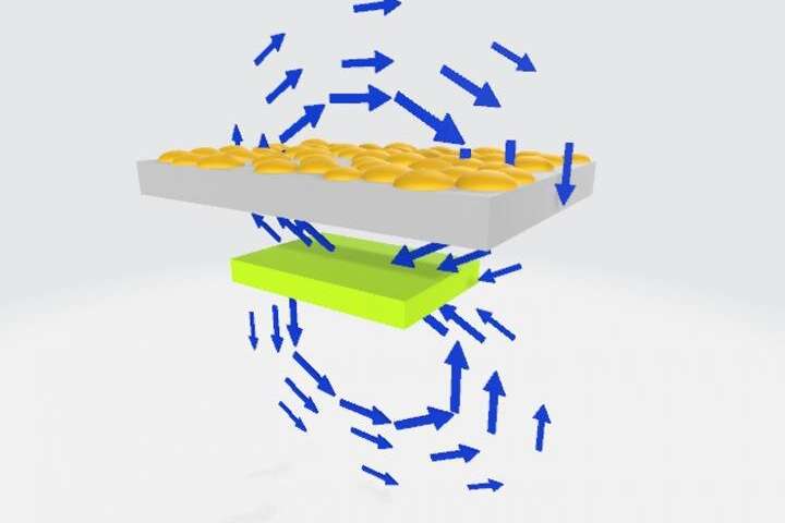 在設(shè)備制造過程中如何使用壓電共振來評估鈀顆粒之間的分離的圖示。當(dāng)將鈀納米顆粒(黃色)添加到樣品中時,振動的壓電材料(綠色長方體)在基板(灰色)表面附近產(chǎn)生交變電場(藍(lán)色箭頭),從而在沉積的鈀(橙色顆粒)中產(chǎn)生電流。這導(dǎo)致壓電材料的一些振動能量損失。當(dāng)鈀顆粒彼此接觸時,能量損失的值最大,因此可以在最佳納米顆粒濃度下停止沉積。