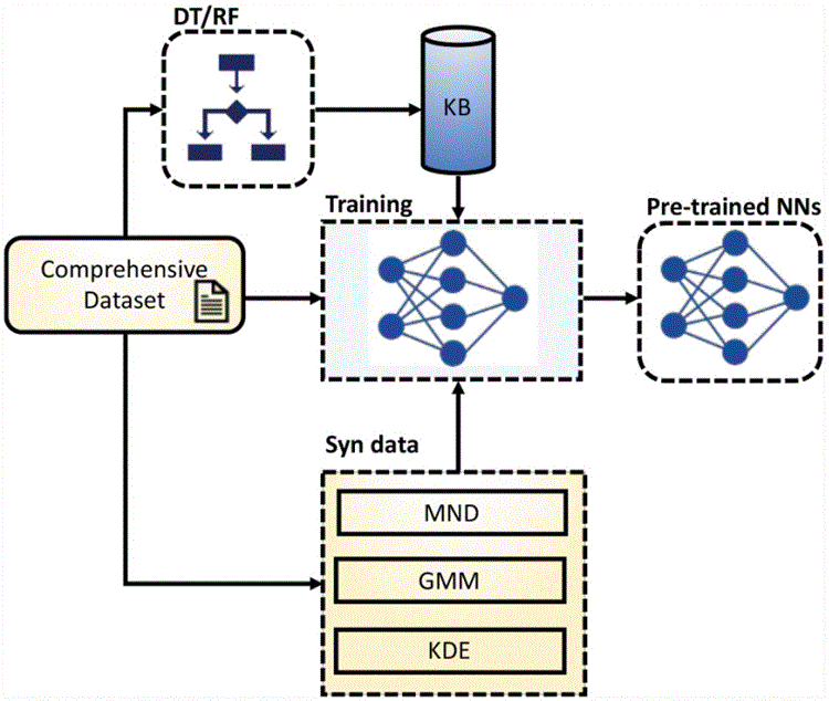 使用合成數(shù)據(jù)集(DT/RF:決策樹/隨機森林,NN:神經(jīng)網(wǎng)絡(luò),KB:知識庫)對 DNN 模型進行預(yù)訓(xùn)練的示意圖。