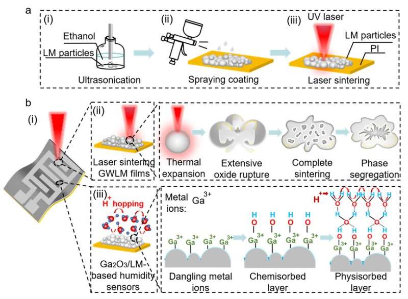 柔性電容式濕度傳感器的設計與制造。(a) 柔性 Ga₂O₃/ 液態(tài)金屬(LM)濕度傳感器的制造過程,包括超聲處理、噴涂和激光燒結(jié)。(b) 通過激光燒結(jié)形成 GWLM(氧化鎵包裹液態(tài)金屬)薄膜的機理以及基于 Ga₂O₃/LM 的濕度傳感器的傳感機理示意圖。圖片來源:《光電子進展》(2023 年)。DOI: 10.29026/oea.2023.220172