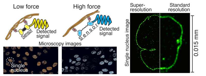 左側(cè)細胞內(nèi)力傳感器的作用原理。熒光蛋白(黃色和青色)源自水母,而類似橡皮筋的部分(黑色)利用了蜘蛛網(wǎng)蛋白。目標(biāo)蛋白結(jié)合抗體(深棕色)源自羊駝。右側(cè)圖像是超分辨率顯微鏡與傳統(tǒng)顯微鏡對細胞核成像的對比。圖片來源:蒂穆・伊哈萊寧,坦佩雷大學(xué)