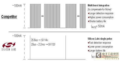 不像競爭方案的紅外線LED必須長時間進行多次脈沖以達到精確的測量,Si1143紅外接近傳感系列使用專利的單一脈沖接近測量技術(如圖4所示),在電源效率上可達到5000倍的改善,電池壽命得以延長。