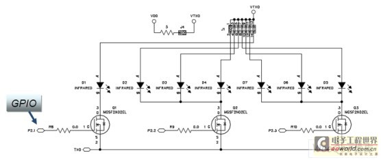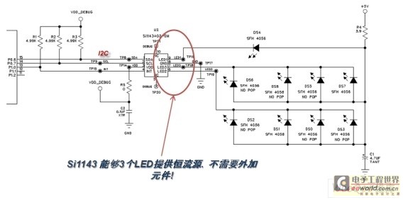 與Si1120不同的是,Si1143帶了三個LED驅(qū)動,當連接多個紅外LED時,如果只有單個LED驅(qū)動(如圖6所示),則需通過MCU來控制MOS管分時驅(qū)動LED,而Si1143(如圖7所示)本身就已具備3個LED驅(qū)動,所以可以直接連接到不同的LED 引腳,勿需再另加外圍器件,為硬件設計節(jié)省了成本。另外,Si1143采用?SMBus接口,可兼容I2C通訊,通用性更強,同時也方便軟件的設計。