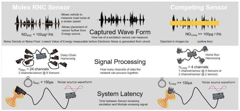 EV的優(yōu)點之一是靜音推進,但從設(shè)計和用戶角度出發(fā),權(quán)衡是道路噪音問題。Molex表示,其新傳感器與ADI網(wǎng)絡(luò)技術(shù)一起可通過縮短聲波消除時間并減輕布線重量來幫助改善RNC。