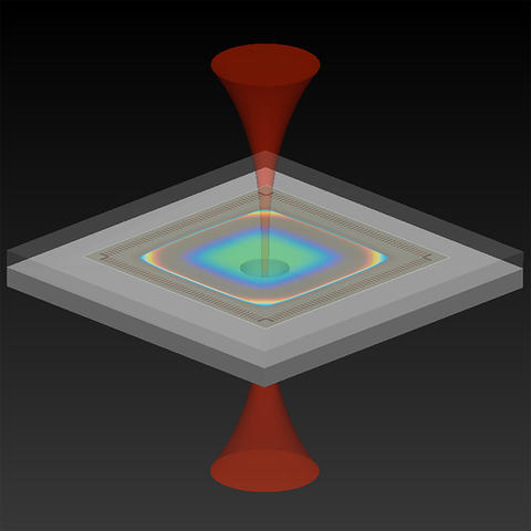 光機械加速度計的圖示,它使用光來測量加速度。NIST設(shè)備由兩個硅芯片組成,紅外激光在底部芯片進入,在頂部發(fā)射。頂部芯片包含由硅梁懸掛的標準質(zhì)量塊,該質(zhì)量塊使質(zhì)量塊可以響應(yīng)加速度自由上下移動。檢測質(zhì)量上的鏡面涂層和連接到底部芯片的半球形鏡形成光學腔。選擇紅外光的波長,使其與腔體的諧振波長幾乎匹配,從而使光在離開兩個反射鏡表面之間多次來回反射時逐漸增強強度。當設(shè)備加速時,檢測質(zhì)量就會移動,從而改變腔體的長度并改變共振波長。這改變了反射光的強度。光學讀數(shù)將強度的變化轉(zhuǎn)換為加速度的量度。