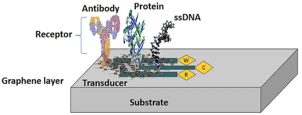 生物傳感器設(shè)備的示例,包括用作傳感器的石墨烯層和用作受體的生物分子。圖片由MDPI提供