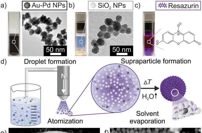 H 2指示劑 SP 的構(gòu)建模塊、制造和形態(tài)表征:a) Au-Pd NP 和 b) SiO 2 NP 分散體的數(shù)碼照片和 TEM 顯微照片;c) 刃天青染料水溶液的數(shù)碼照片;d) 通過液滴蒸發(fā)(使用噴霧干燥作為工具)將 SP 制造成自由流動(dòng)的紫色粉末的示意圖;e) SP 和 f) 其表面的 SEM 顯微照片。來源:先進(jìn)功能材料(2022)。DOI: 10.1002/adfm.202112379