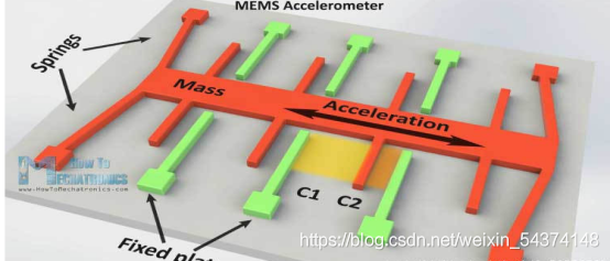 首先了解一下MEMS加速度計的原理,簡圖如下圖所示,其中質(zhì)量塊mass被彈簧springs支撐,使得其只能沿著預(yù)定方向位移,從而檢測特定方向的加速度;綠的部分是固定的電極板Fixed plates。檢測原理是當質(zhì)量塊感受到加速度時,會在相應(yīng)方向產(chǎn)生位移,從而使得固定電極板構(gòu)成的兩個平行板電容器C1,C2的電容大小發(fā)生改變,檢測其電容值大小即可換算成相應(yīng)的加速度