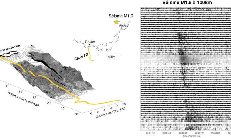 位于弗雷瑞斯(瓦爾)以北的1.9級(jí)地震產(chǎn)生的地震波記錄在沿土倫附近海底部署的41公里長(zhǎng)的光纜上。在右側(cè)的記錄中,每條線對(duì)應(yīng)一個(gè)沿著電纜的測(cè)量點(diǎn),從海岸(頂部)到大海(底部)。(41公里的電纜相當(dāng)于6000多個(gè)傳感器)。各個(gè)測(cè)量點(diǎn)處的波到達(dá)時(shí)間之差用于確定地震的位置。
