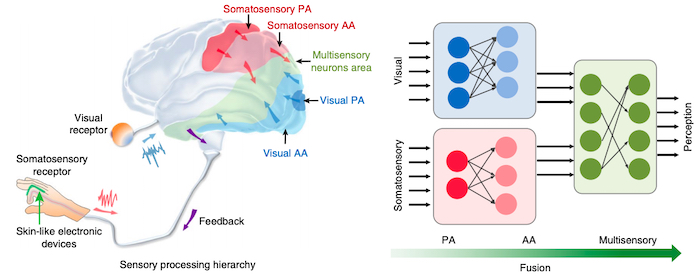 為了應(yīng)對這一挑戰(zhàn),南大新加坡團隊開發(fā)了一種“生物啟發(fā)”的數(shù)據(jù)融合系統(tǒng),該系統(tǒng)將類似皮膚的可拉伸應(yīng)變傳感器與AI系統(tǒng)結(jié)合使用。這些技術(shù)結(jié)合在一起,類似于人腦共同處理皮膚的感覺和視覺的方式。
