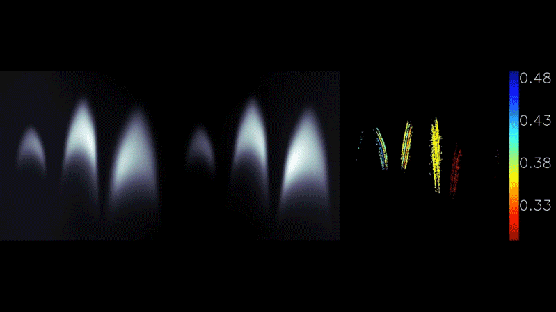 圖片顯示了金屬深度傳感器實時工作,以捕獲透明蠟燭火焰的深度。左側(cè)的兩個圖像是在相機傳感器上捕獲的原始圖像。它們由金屬元素形成,并且模糊程度略有不同。研究人員從這兩幅圖像中實時計算出物體的深度。右圖顯示了計算出的深度圖。圖片來源:郭琦和石柱君/哈佛大學
