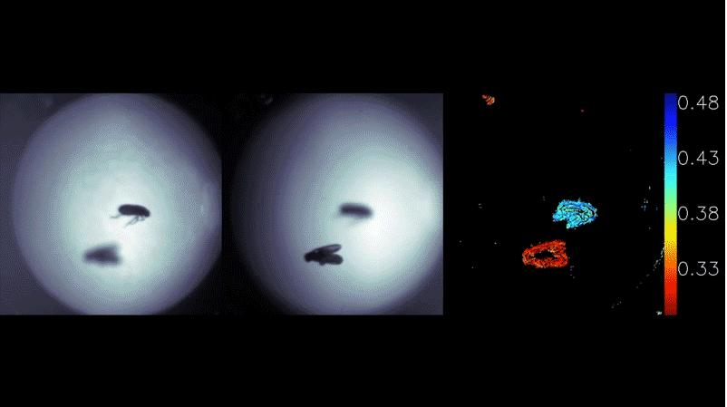 視頻顯示了金屬化深度傳感器實時工作以捕獲果蠅的深度。左側(cè)的兩個圖像是在相機傳感器上捕獲的原始圖像。它們由金屬元素形成,并且模糊程度略有不同。研究人員從這兩幅圖像中實時計算出物體的深度。右圖顯示了計算出的深度圖。圖片來源:郭琦和石柱君/哈佛大學