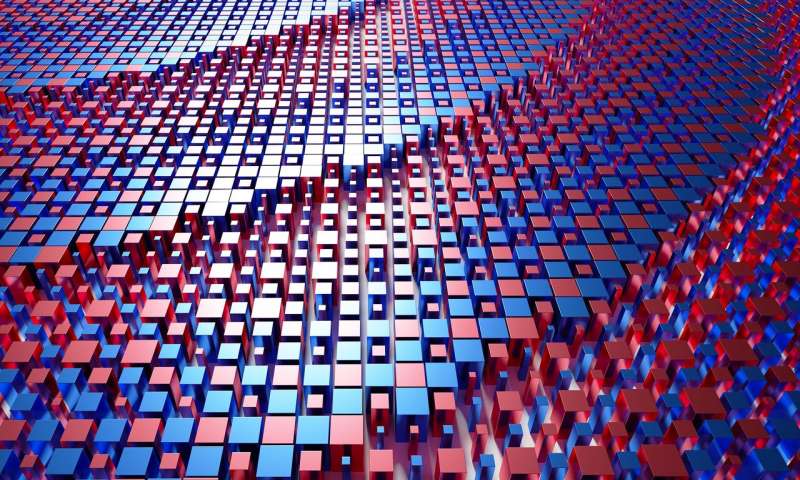 為緊湊的深度感應設計的金屬元件的插圖。它由亞波長間隔的方形納米柱組成。通過交替顯示兩種不同的納米柱圖案(在此以紅色和藍色顯示),該金屬元素同時形成了兩個圖像。這兩個圖像模仿了跳躍蜘蛛眼中分層視網(wǎng)膜捕獲的圖像。圖片來源:郭琦和石柱君/哈佛大學