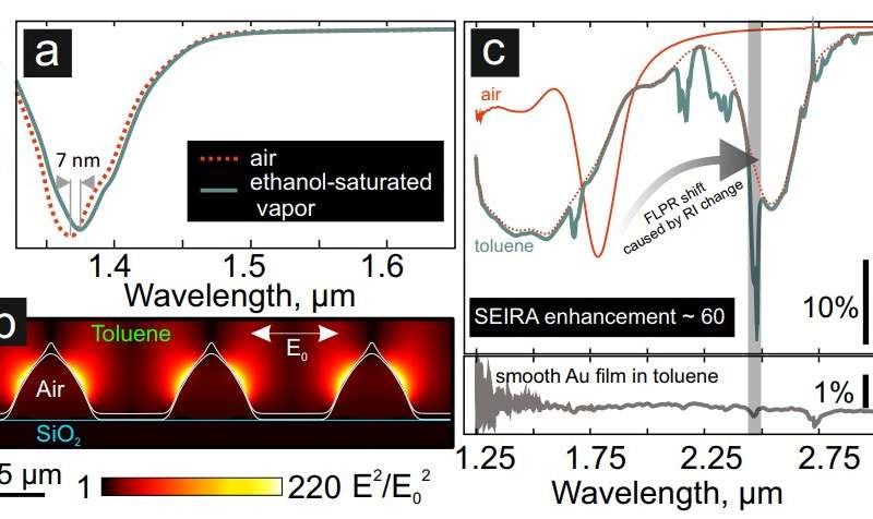 一階晶格等離子體共振(FLPR)的各種應(yīng)用a)由注入飽和乙醇蒸氣引起的納米空隙陣列SP傳感器的光譜響應(yīng)。(b)在2.5μm波長的線性極化光源從頂部激發(fā)納米空隙陣列的表面附近時(shí),計(jì)算出的平方化歸一化EM場振幅E2 / E2 0靠近甲苯。(c)在空氣中和在甲苯液體層下的納米空隙陣列的FTIR反射光譜。如果不吸收甲苯,則虛線表示納米空隙陣列對(duì)反射光譜的貢獻(xiàn)。底部面板顯示了在相同條件下從被甲苯覆蓋的光滑Au膜表面反射的FTIR反射。