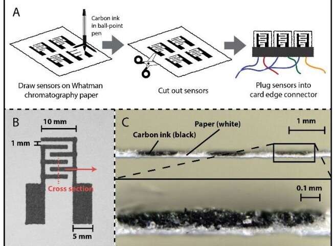 (A)紙基電子氣體傳感器(PEGS)的制造。碳電極用圓珠筆和切刀繪圖儀打印在WhatmanTM纖維素色譜1紙上,可快速制作所需幾何形狀的原型。打印完成后,將傳感器切割并放置在卡式邊緣連接器內以進行表征。(B)單個PEGS的俯視圖,該PEGS由兩個帶有三個手指的電極組成,每個手指之間的間距為1 mm。(C)跨三個手指的PEGS的橫截面(B中的紅色虛線)。碳墨水(黑色)部分滲入紙張(白色)。圖片來源:ACS Sensors(2019)。DOI:10.1021 / acssensors.9b00555