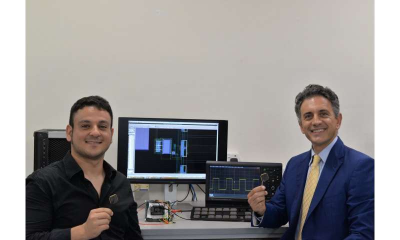 NUS研究人員發(fā)明了一種低成本的“無電池”喚醒定時器,可將IoT傳感器節(jié)點的功耗降低1000倍,從而有助于持久運行。 喚醒定時器嵌入在測試芯片中,并放置在較大的封裝中(由兩個研究人員持有),以便于測試和表征。 左起:新加坡國立大學(xué)工程學(xué)院的Orazio Aiello博士和Massimo Alioto副教授學(xué)分:新加坡國立大學(xué)
