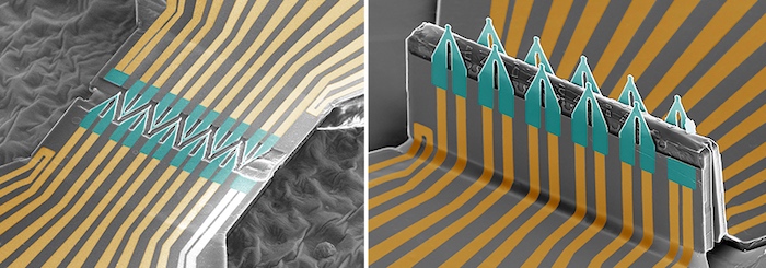 根據(jù)他們?cè)贜ature Nanotechnology上發(fā)表的文章,該團(tuán)隊(duì)首先將 FET 制造成 2D 形狀,將形狀的特定點(diǎn)粘合到預(yù)拉伸的彈性體片材上,然后松開片材,從而構(gòu)建了 3D FET 陣列。這個(gè)過程導(dǎo)致了一個(gè)彎曲的器件,并導(dǎo)致 FET 折疊成一個(gè) 3D 陣列結(jié)構(gòu),可以很容易地穿透細(xì)胞。