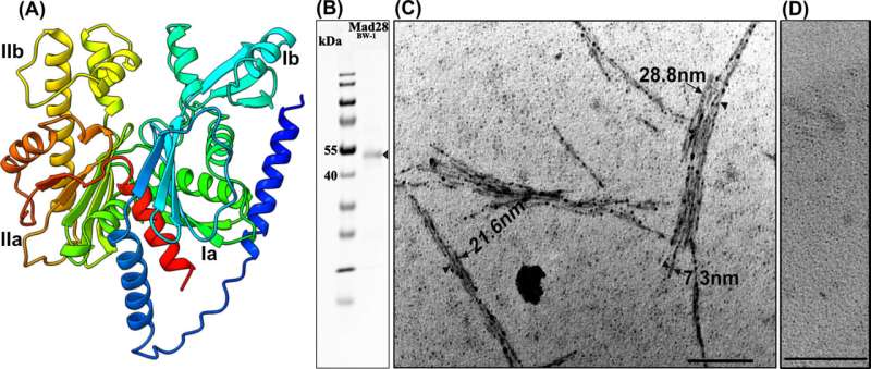 (A) Alphafold預(yù)測(cè)的BW-28的Mad1三維結(jié)構(gòu)模型。結(jié)構(gòu)中標(biāo)明了四個(gè)肌動(dòng)蛋白結(jié)構(gòu)域 Ia、Ib、IIa 和 IIb。(B) 純化的 N 端 His 標(biāo)簽的 Mad28 的 SDS-PAGEBW-1型來(lái)自大腸桿菌。(C)Mad28的體外聚合BW-1型在存在 ATP-γ-S 且沒(méi)有 ATP (D) 的情況下,通過(guò) TEM 可視化。比例尺,100 nm。圖片來(lái)源:mBio (2023)。DOI: 10.1128/mbio.01649-23