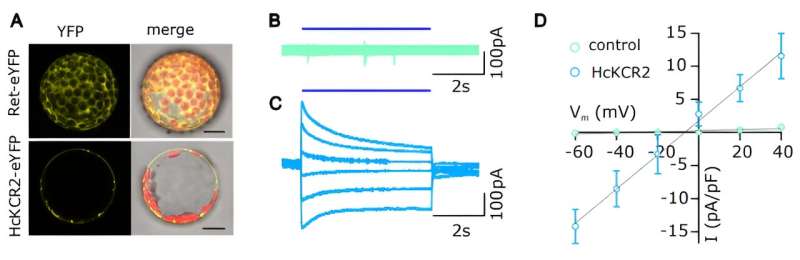 HcKCR2 在植物細胞中起作用 A. 表達 eYFP 標記的 HcKCR2 或?qū)φ?(Ret-eYFP) 的本氏奈瑟菌原生質(zhì)體的共聚焦圖像,在瞬時轉(zhuǎn)化后 48 小時捕獲。B-C.用對照構(gòu)建體(B)或HcKCR2(C)轉(zhuǎn)化的本氏奈瑟菌原生質(zhì)體的膜片鉗實驗中記錄的全細胞電流。將細胞保持在 -60 mV 的保持電位,并以 40 至 -60 mV 的步長進行測試,遞減 20 mV,持續(xù) 8 秒。5 s BL 脈沖 (λ = 490 nm, 5 mW/mm2)施加在每個電壓階躍上。D.對照和HcKCR2表達原生質(zhì)體的I-V關(guān)系。圖片來源:科學(xué)(2023 年)。DOI: 10.1126/science.adj9696