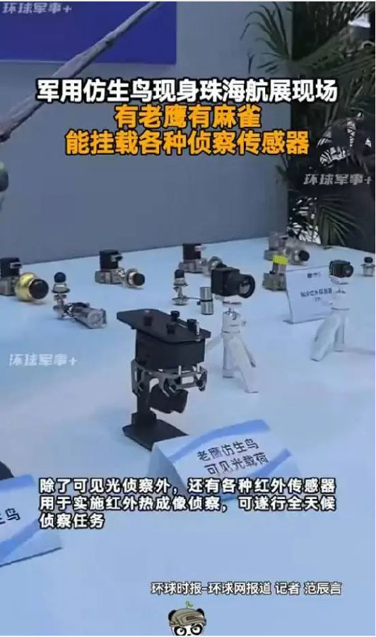 軍用仿生鳥(niǎo):在珠海航展現(xiàn)場(chǎng)的“中國(guó)軍工”展區(qū),展出了許多軍用仿生鳥(niǎo)及其配套的各種傳感器。它們之中有老鷹有麻雀,能掛各種偵察傳感器。這種形態(tài)逼真的仿生鳥(niǎo)在執(zhí)行隱蔽偵察任務(wù)中,撲翼無(wú)人機(jī)在空中盤旋,對(duì)手可能根本無(wú)法意識(shí)到自己正處于監(jiān)視中,猶如好萊塢電影中的畫面。
