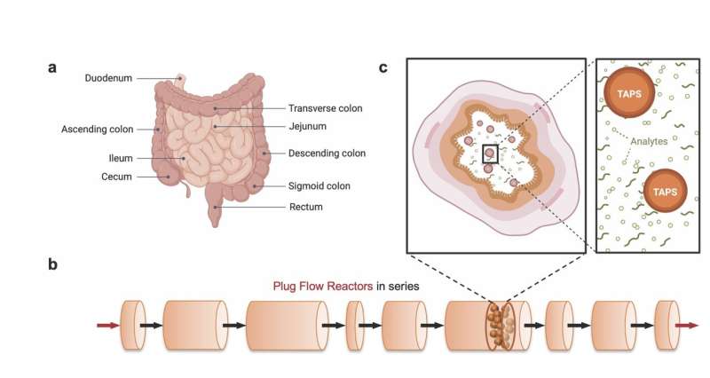 人體腸道系統(tǒng)(a)可被視作一系列活塞流反應(yīng)器(b),這是一種用于描述流動圓柱體系內(nèi)化學(xué)反應(yīng)的模型。具有時間感知能力的微粒傳感器(c)在活塞流系統(tǒng)中移動,檢測被稱為分析物的目標化學(xué)物質(zhì)。圖片來源:馬寧等人,2025 年。部分圖片由 BioRender 軟件制作。