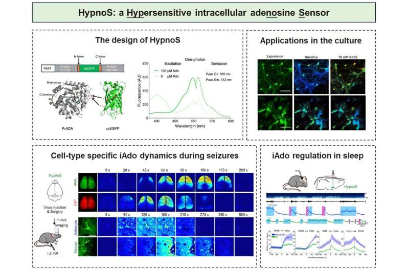 這種名為 “超靈敏細(xì)胞內(nèi)腺苷傳感器”(Hypersensitive intracellular adenosine Sensor, HypnoS)的工具,能夠在活體動(dòng)物大腦中以高時(shí)空分辨率監(jiān)測(cè)癲癇發(fā)作或睡眠 - 覺(jué)醒周期中的 iAdo 動(dòng)態(tài)變化。